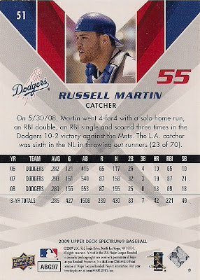 A quick post on this Thanksgiving morning. Today marks your last chance to enter my second contest, which closes with tomorrow's recap post. Moving on, my love of Upper Deck Spectrum is no secret, and though my Russell Martin Spectrum Swatches Rainbow deals with 2008, I won't pass up a good Martin when I see one.