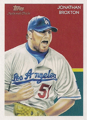 This is an entirely sweet Big Jon card, with a great portrait of the fireballer. I've made it no secret that I'm a huge and unabashed Jonathan Broxton fan, and I wish him all the best in Kansas City. I firmly believe the Dodgers should have brought him back, as his velocity returned after his rehab stint earlier this year before he was shut down. There was very little risk in bringing back a guy who was one of the greatest relievers in franchise history. But no, wasting money on garbage like Adam Kennedy and John Grabow is a far better idea Ned Colletti.