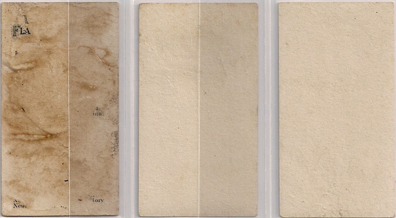 A quick look at the backs reveals, in all likelihood, the primary reason these were so cheap: there aren't any backs to speak of in this "trimmed" lot (the seller's words, and perhaps skinned as well, or whatever the term for non-existent backs on hundred-plus-year-old cardboard is).